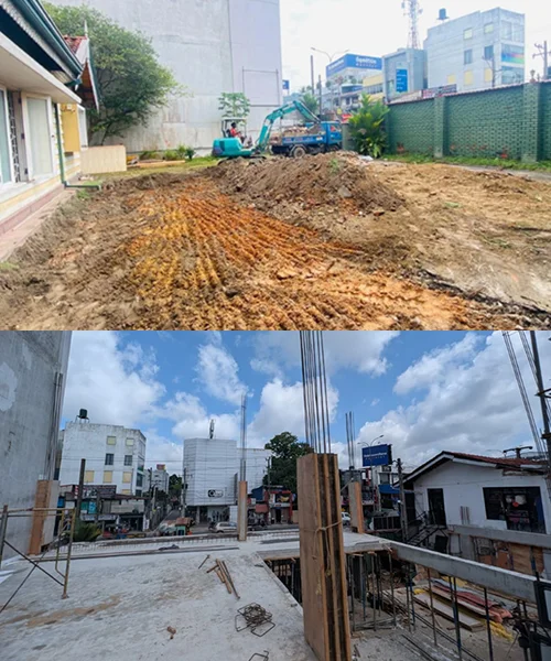 At the Kiribathgoda site, construction of a five-storey commercial building covering 1,965 sq.ft is underway. Structural and masonry works are actively progressing across all levels, and preparation for electrical, plumbing, and finishing works is in process. Safety and timeline adherence remain key priorities.